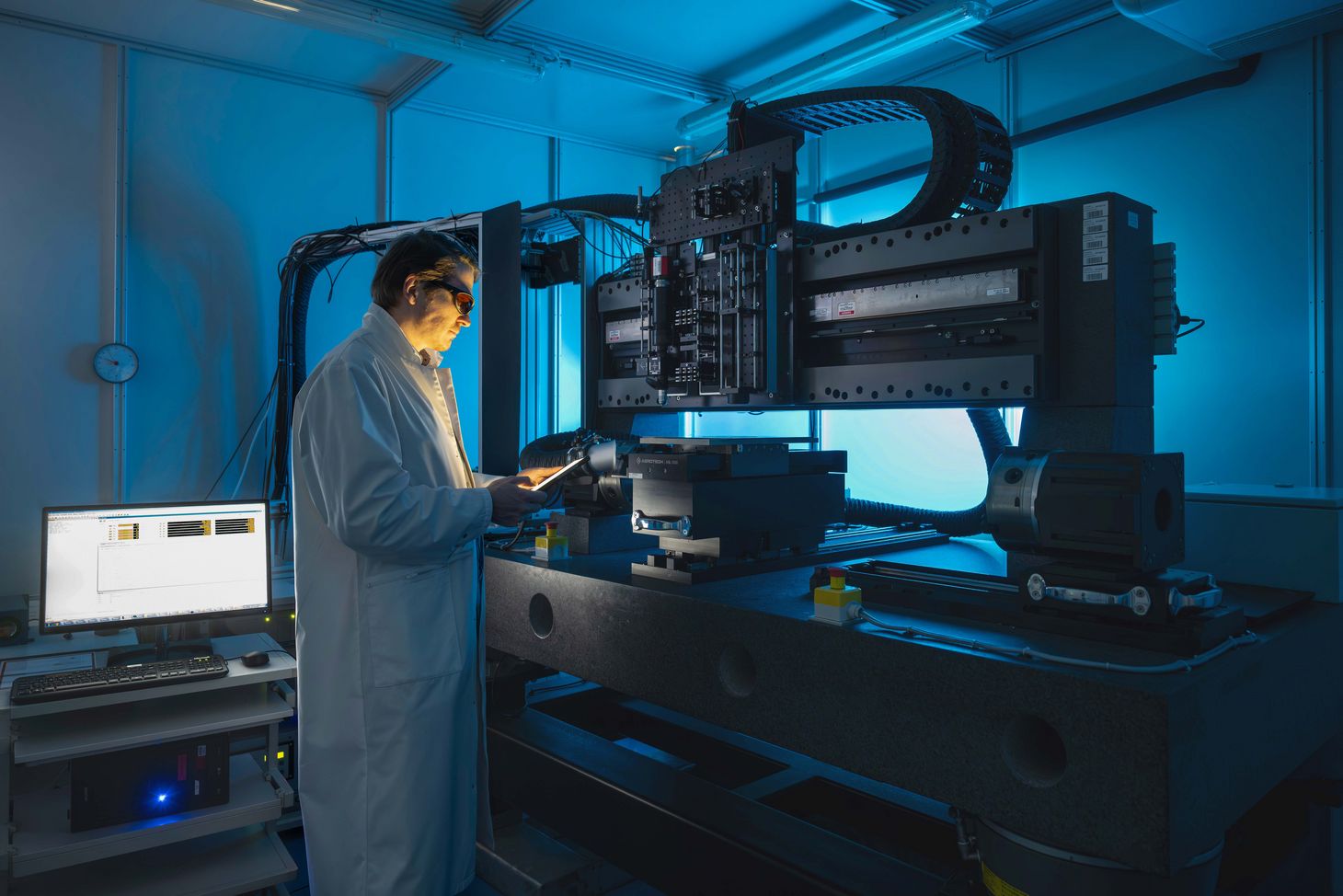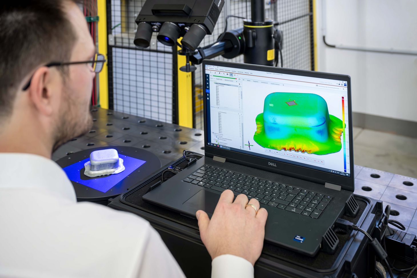 The laser experts can already report positive results in this sub-project, too. Here, they work with an optical device for detecting the planned laser engravings. The device, which is roughly the size and shape of an arm, is sitting atop a lab table, and Lasagni places a processed metal plate beneath it. The tool then measures the diffraction angles and positions generated by the laser-structured surface. To ensure the laser-engraved information is protected, the researchers plan to hide such markings in a groove and store the data in a digital twin.