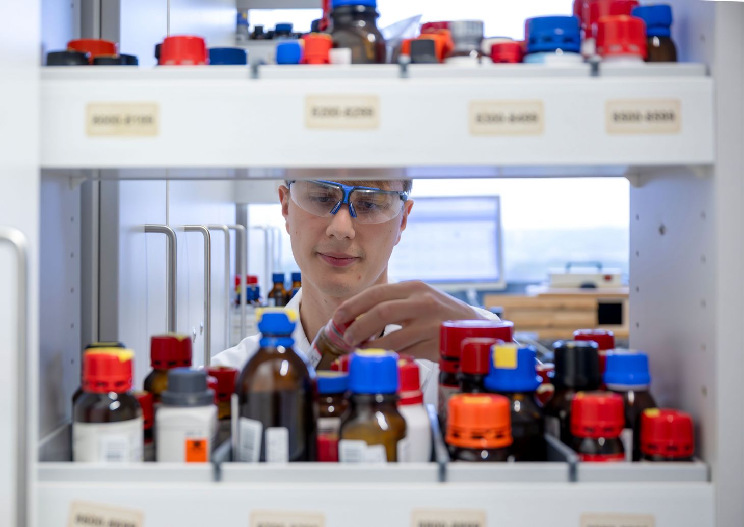 Für die Reaktion geben die Forschenden dem Ausgangsstoff, dem Furan, Wasser, Lichtenergie und einen Photokatalysator zu. Dadurch wird das Furan zuerst in einen Zwischenzustand überführt, der dann schrittweise zu einem linearen Molekül zerfällt. Eines dieser Zielprodukte ist Succinaldehyd. «Dabei handelt es sich um eine mögliche neue, biobasierte Grundchemikalie, etwa für die Medikamenten- oder Kunststoffproduktion», sagt Frank. Auf der Basis von Erdöl lässt sich Succinaldehyd kaum wirtschaftlich herstellen – nicht weniger als fünf Umwandlungsschritte sind dafür nötig.
